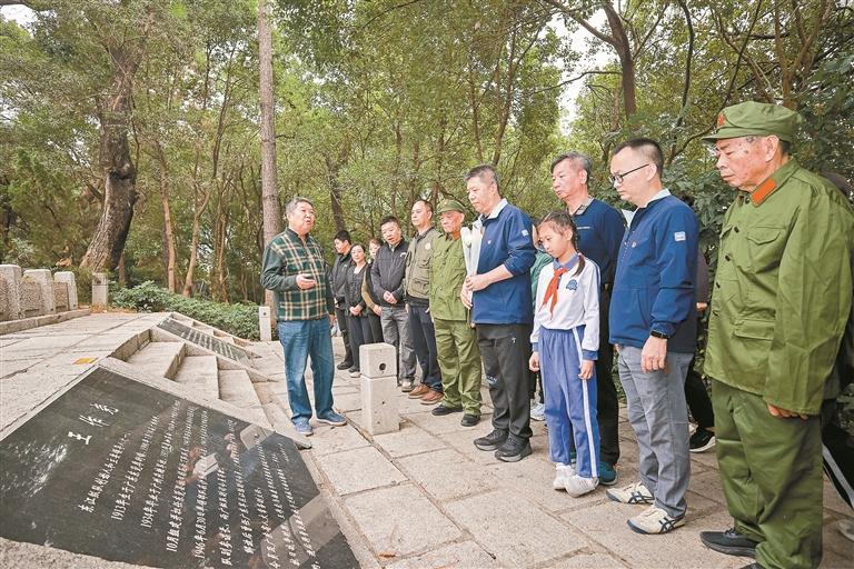 随后,朱赤带领全体参与人员实地参观纪念设施,结合现场实物史料,深入解读了纪念碑、烈士墓、烈士芳名亭背后的历史背景,让大家对东江纵队的革命历史有了更深刻的认知。朱赤还和大家分享了一个故事:杨康华原名虞焕章,据他的女儿介绍,父亲心怀建设健康中华的抱负,特意改名“杨康华”,以此寄托对国家和民族的深切期许。