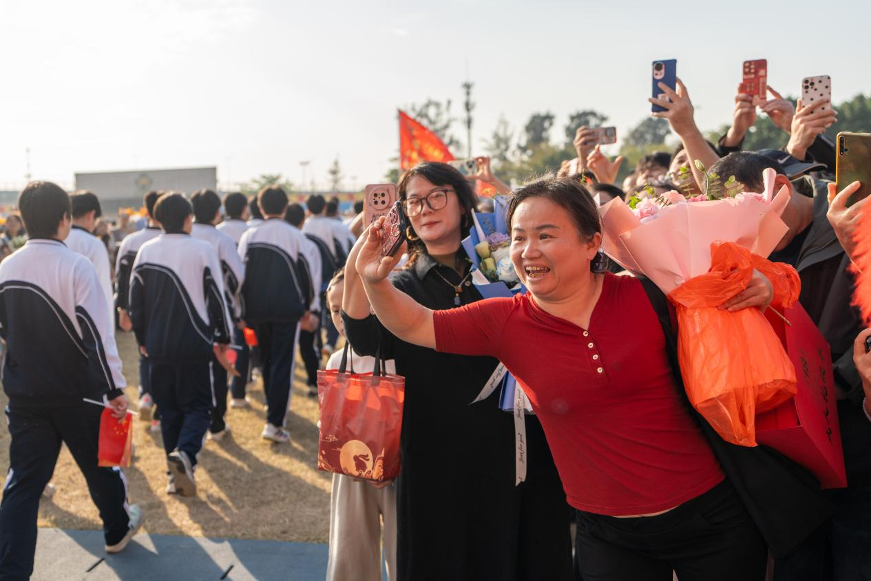 活动中,“穿校服的CEO”魏思远、“宝安皮尔洛”潘锘钧和“火箭少年”王裕宁三位优秀青年代表通过视频分享奋斗故事,激励同龄人勇敢追梦。家长代表李庆军深情致辞,感恩学校培育,呼吁孩子们心怀家国、砥砺前行。温情环节《爱的拥抱》中,亲子间的真挚告白与感恩礼感动全场,师生互赠鲜花则凝聚了三载教诲的深情。学生代表李淇琳誓言以拼搏回报青春,全体学子面向国旗庄严宣誓,并获赠《宪法》与成人纪念卡,标志着责任与使命的传递。最后,同学们携手跨越“成人门”,在心愿墙写下憧憬,以坚定步伐迈向未来。