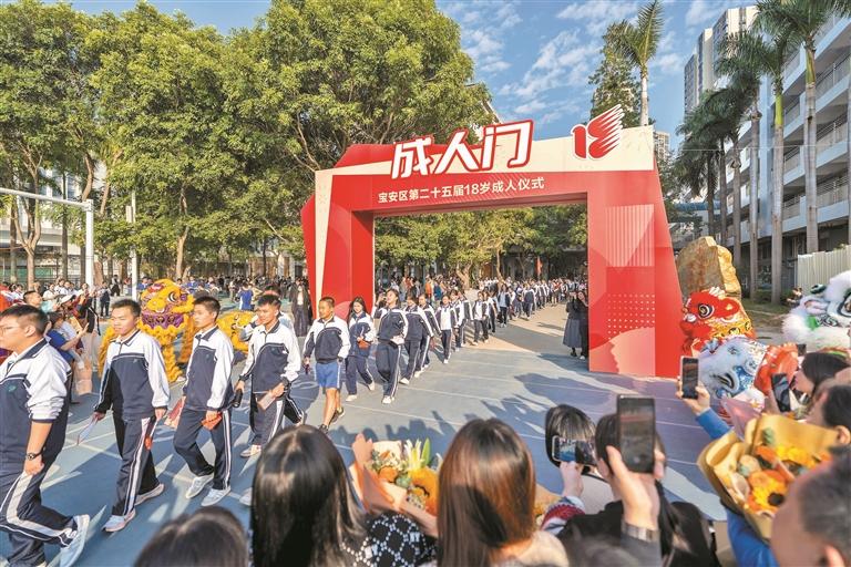 千人同宣誓,齐行成人礼。为深入学习宣传贯彻党的二十届四中全会精神,进一步加强全区适龄学生思想政治引领和价值引领,引导适龄青少年树立成人意识,增强爱国意识、公民意识、宪法和法律意识、责任意识、感恩意识,努力培养青年学生成为担当民族复兴大任的时代新人,12月18日,团区委、区教育局、区关工委、区文明办在前海未来教育集团西乡中学高中部联合举行“青春挺膺担当,强国复兴有我”宝安区第二十五届18岁成人仪式。