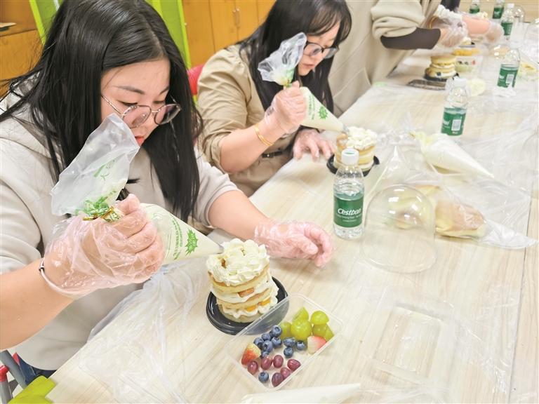 居民在老师指导下制作精美蛋糕。