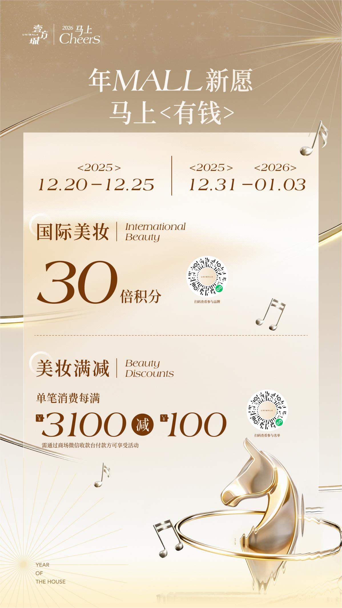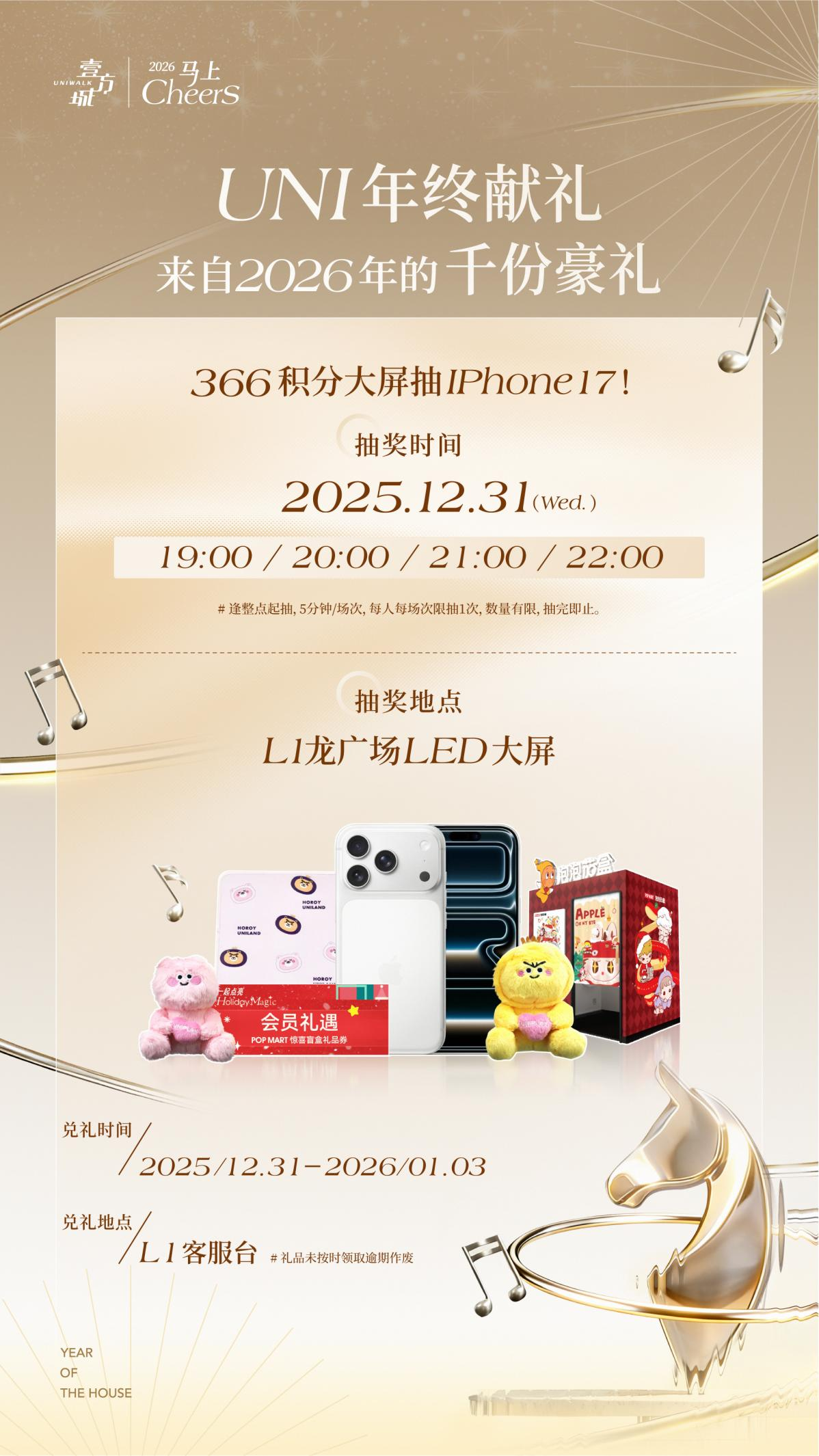 除了丰富的IP体验,前海壹方城年MALL钜惠福利同步加码,全场最高享30倍积分,国际美妆、精品零售高至30倍积分,国际腕表享20倍积分,黄金珠宝享5-10倍积分,消费福利全面升级。跨年夜专属福利重磅开启,1000份跨年好礼现场抽奖,12月31日19:00、20:00、21:00、22:00四个时段,于L1龙广场LED大屏开启惊喜抽奖,100%中奖率,最高可赢取iPhone 17 Pro 512G大奖。同时,国际美妆单笔每满3100减100,精品零售单笔每满10000减500,会员享2小时免费停车,超值优惠助力年终焕新!