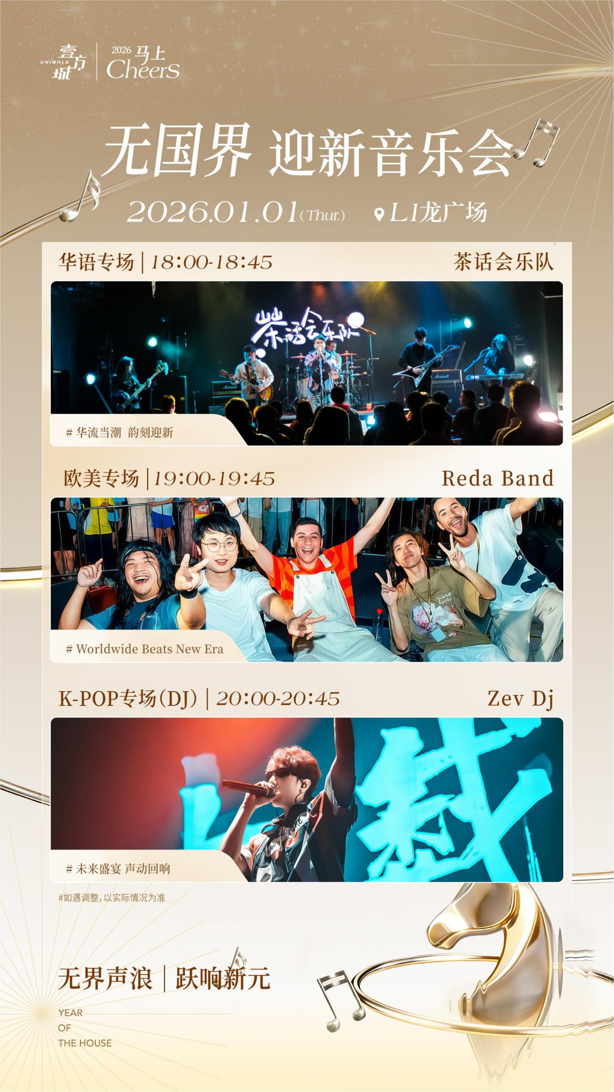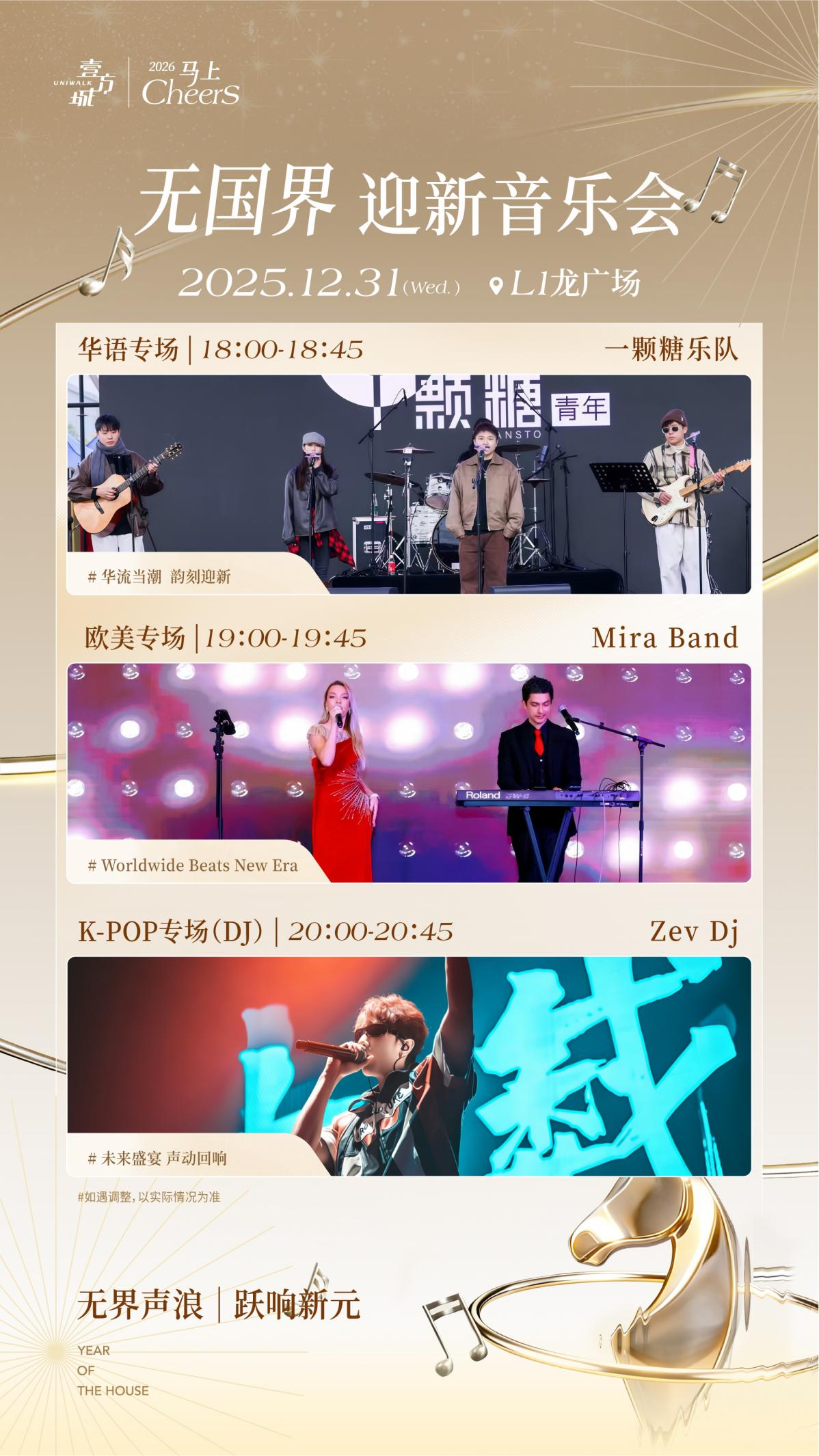 12月31日至1月1日,前海壹方城X一颗糖乐队共创无国界迎新音乐会,每日18:00-18:45华语乐队专场、19:00-19:45欧美乐队专场、20:00-20:45 DJ REMIX K-POP派对专场,在L1龙广场与大家一起跨年,同时晚上19:00、20:00还有浪漫飘雪,希望带给大家最浪漫的跨年回忆。