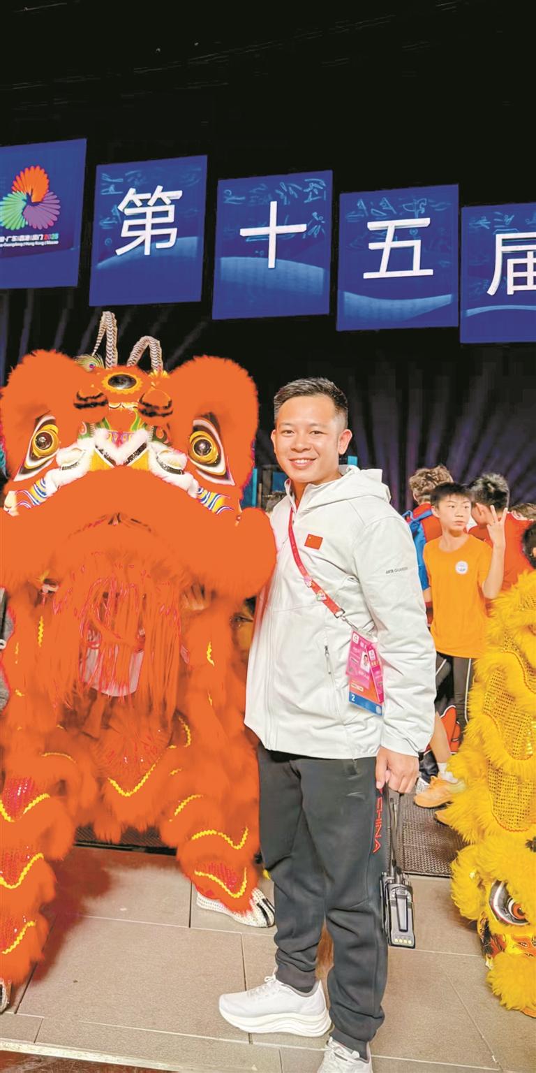 我是福海桥头醒狮团总教练谭展飞。2025年11月11日下午,第十五届全国运动会群众展演舞龙舞狮项目决赛现场,由我们宝安福海桥头醒狮团主力队员领衔,联合港澳青年精英组建的粤港澳联队,凭借一套行云流水、技艺双绝的高桩自选动作,拿下了9.28分的高分,勇夺南狮自选项目金牌。这可是全运会史上首次三地联合组队夺冠。