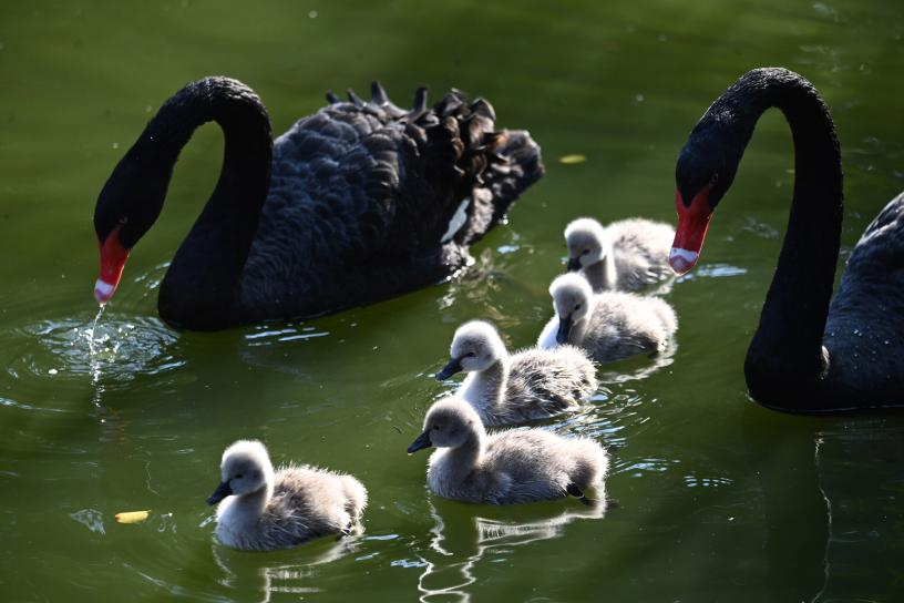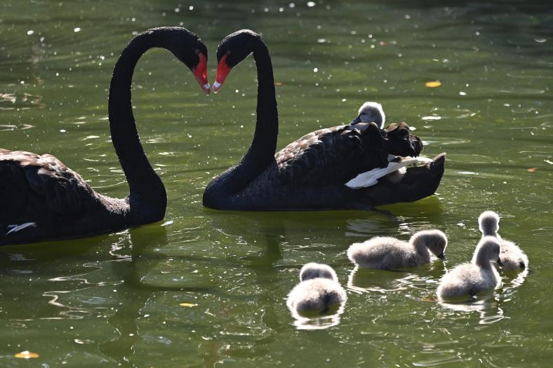 1月5日,深圳野生动物园天鹅湖里,5只小黑天鹅在其“父母”的保护下,小家伙们一起游动、觅食、玩耍,“天鹅夫妇”对小家伙们疼爱有加,把自己所有的生活技能毫无保留地传授给小天鹅们,小家伙们细心地跟着“父母”学习生活本领。黑天鹅一家享受天伦之乐。