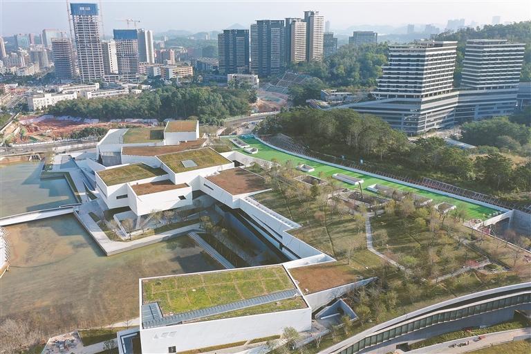 设计上,项目深度融合周边自然山水资源,将山体覆土引入建筑群屋面,实现城市公园与建筑屋顶的无缝衔接,让封闭屋顶变身开放公共空间。沿岸24小时免费开放的滨水空间通过亲水平台、廊桥等多元形式,构建起人与自然、人与文化互动的载体,尽显人文关怀。其创新设计手法广受国际认可,先后斩获2018WAF世界建筑节优胜奖、2022IAA国际建筑奖等六项国际大奖,成为龙华建筑文化新名片。
