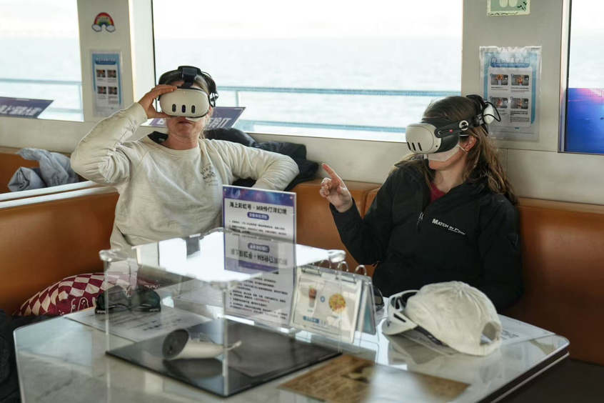 航线途经深中通道、西湾红树林、“湾区之光”摩天轮等10处城市地标,全程约18公里,单程航行约100分钟。游船缓缓前行,城市天际线、海湾景观与重大工程依次铺展。水手们佩戴MR眼镜,沉浸式了解深圳的城市演进脉络;当游船驶入深中通道海域、从深中大桥下方穿行而过时,船上不时响起赞叹声。