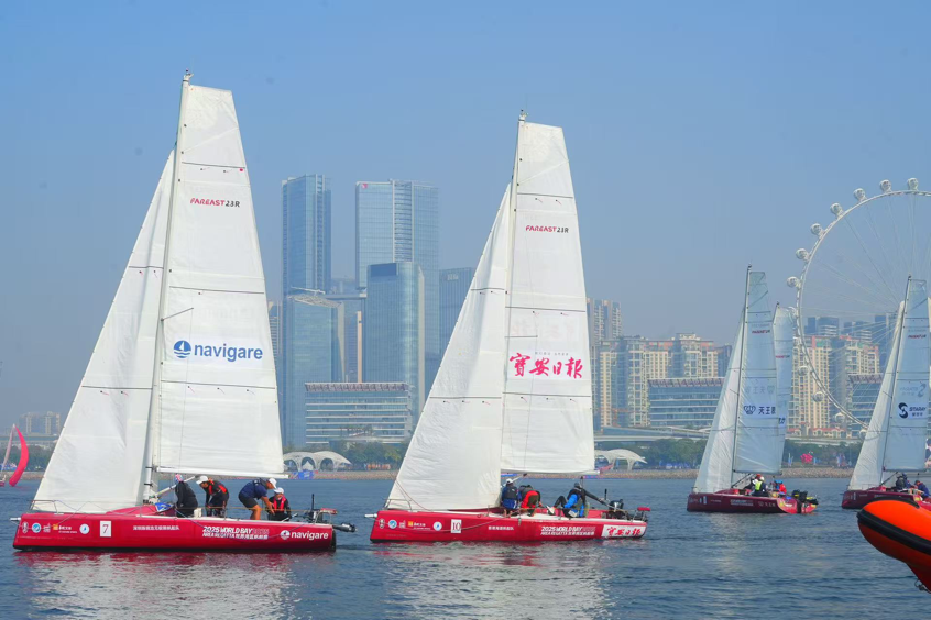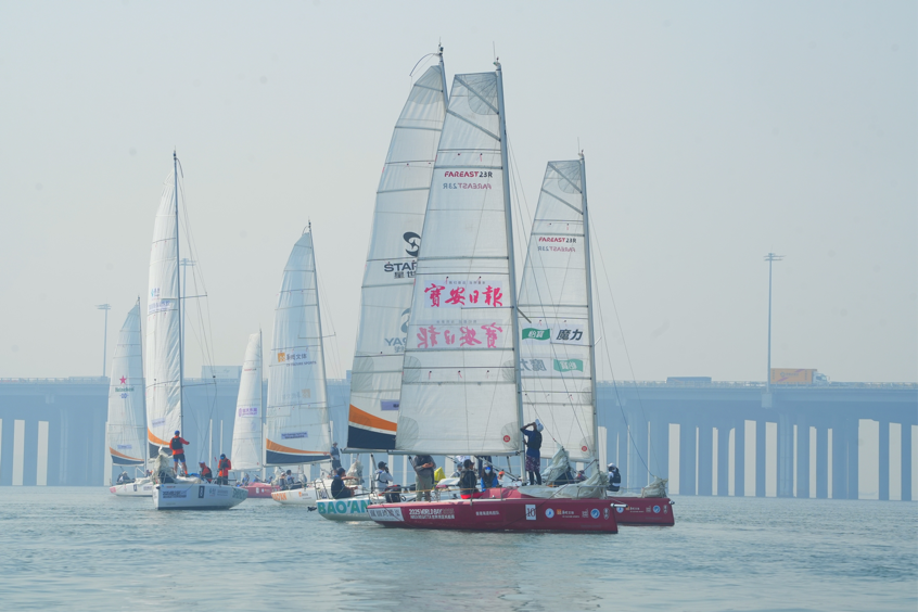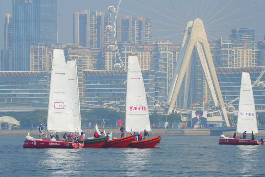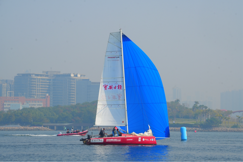 1月13日上午,2025世界湾区帆船赛在宝安欢乐港湾鸣枪开赛。在珐伊23R级别比赛中,“宝安日报号”帆船正式驶入赛场,由香港海道帆船队执航亮相。