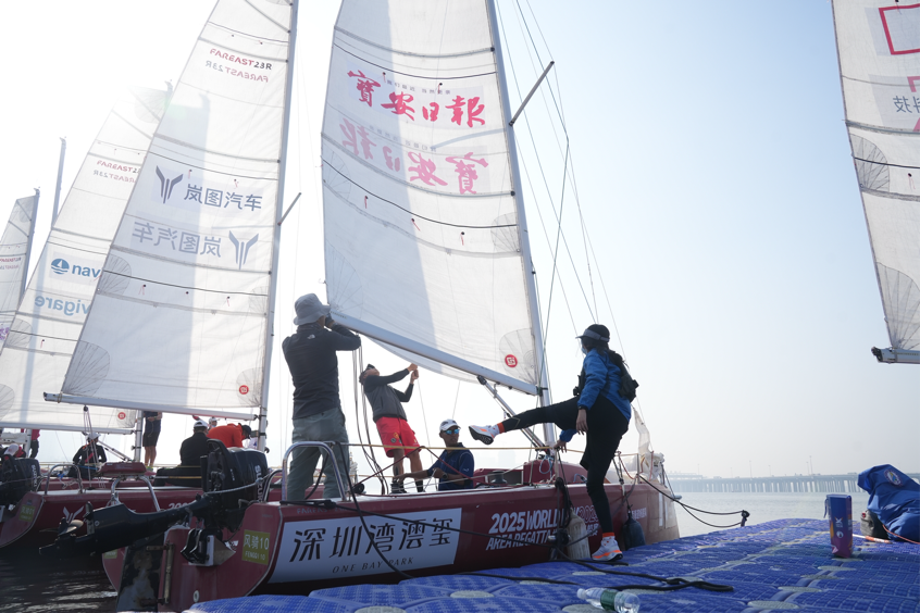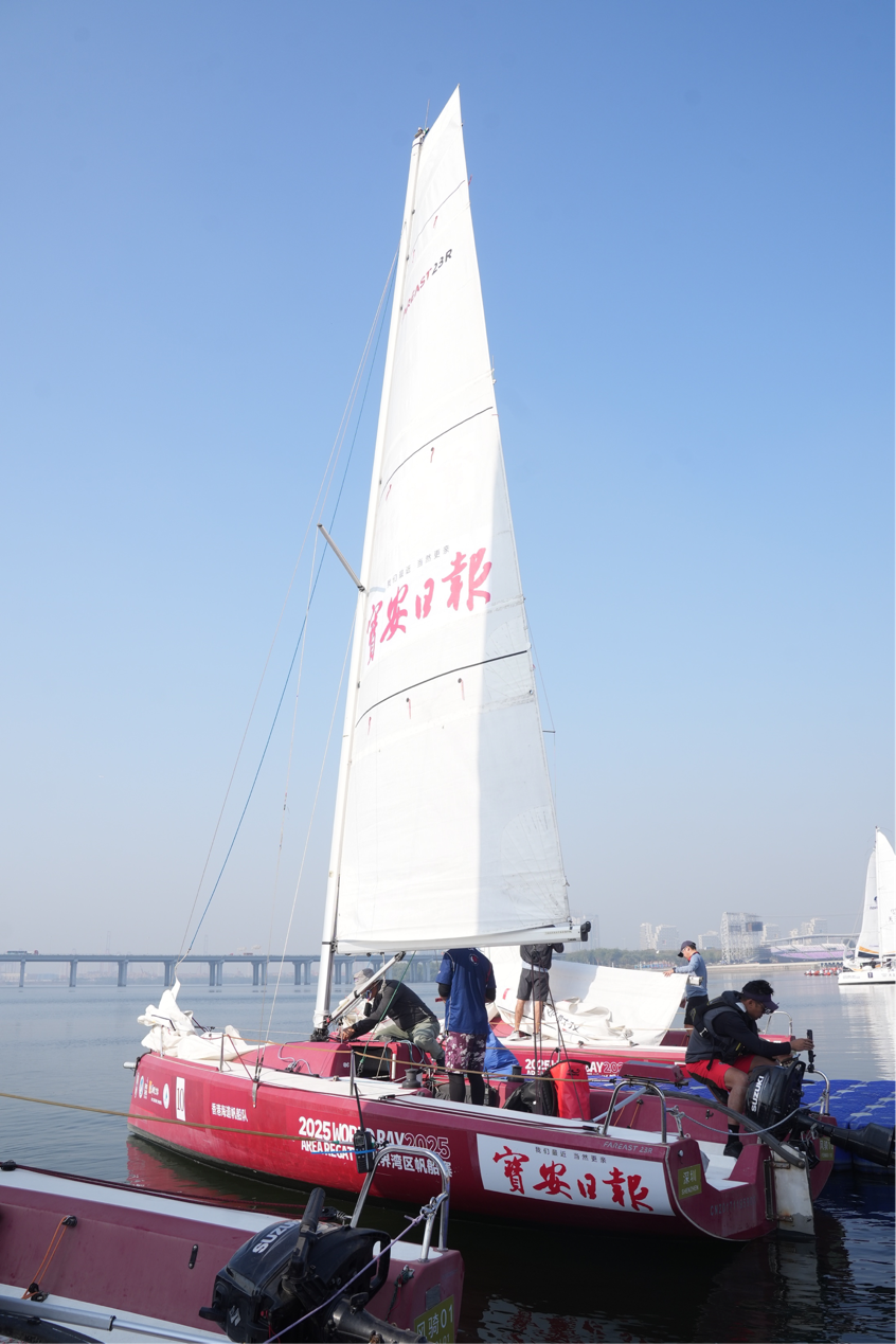 赛前最后的准备阶段,船长梁重权将一台由宝安企业影石Insta360全景相机固定在船尾,用于全程记录比赛过程。这艘驶入赛道的“宝安日报号”,不仅是一艘参赛帆船,更汇集了多重“宝安元素”:以宝安主流媒体命名的帆号、宝安企业的智能影像设备,以及在宝安海域展开的国际级赛事舞台,使其成为赛场上一艘“含宝量”十足的帆船