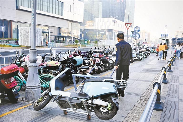 在治理过程中,福永街道创新投用的“移车神器”成为一大亮点。该街道借鉴其他地方工作经验并结合实际改进优化,引进并自行制作了50个“移车神器”(非机动车挪车器)。这种“移车神器”由铁管焊接组装而成,质量轻巧、操作方便,单人通过“叉、抬、拖”三个步骤,就能快速挪移违规停放的非机动车。