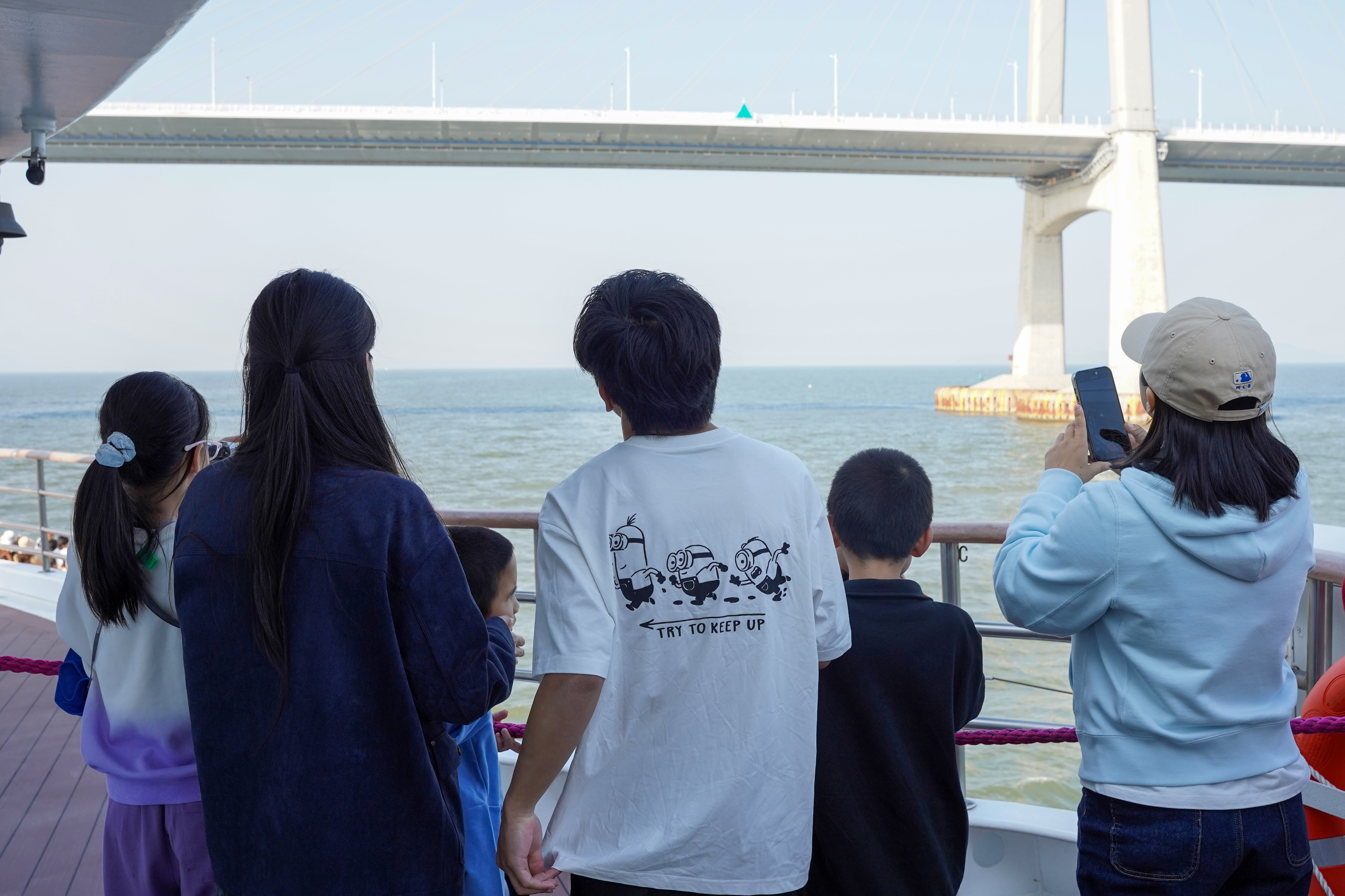 随着游轮驶入伶仃洋,港珠澳大桥的轮廓逐渐清晰。当船身靠近青州航道桥时,中国结造型的桥塔赫然映入眼帘,阳光下的钢铁折射出璀璨的光芒。哇!真的好长!好酷!”彬彬放声惊呼。趴在船舷边的庚庚激动之时,现场唱起了自己最擅长的歌《不再犹豫》,赢得了周围游客的热烈掌声。颖颖显得格外安静,当记者问她原因时,她笑着说:“真的太美了,我想把这些美景记在心里,回去分享给小伙伴们。”简简单单的一句话,让记者心头一暖。