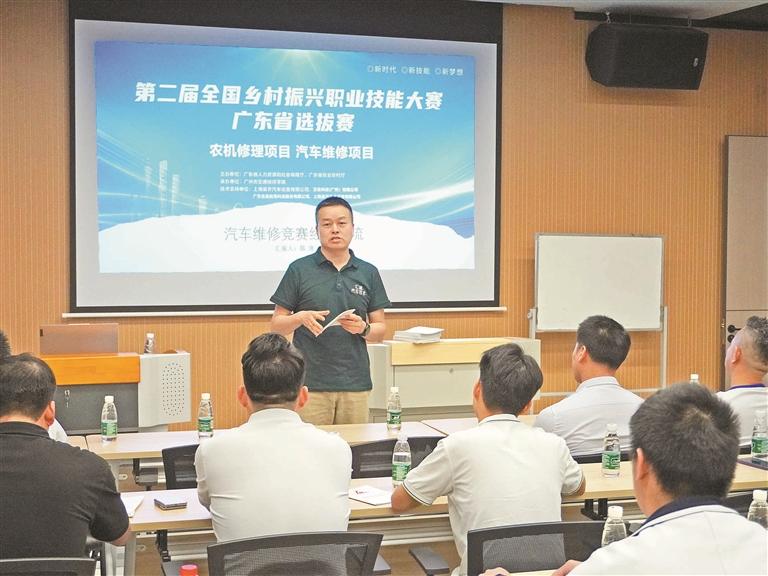 在第二届全国乡材振兴职业技能大赛广东省选拔赛农机修理项目、汽车维修项目现场,全国劳动模范李明权进行交流分享。