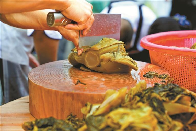 正因为关系到生计,溪头人对酸菜格外讲究。选菜必须是贯心芥菜,腌制全程不放水,只靠菜本身出汁发酵。这样腌出来的酸菜,脆、耐放、不易坏,拿到集市上更受欢迎。