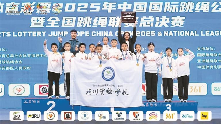 昨日,宝安区实验学校(集团)燕川实验学校传出喜讯,在不久前落幕的2025年中国国际跳绳公开赛暨全国跳绳联赛总决赛中,该校跳绳队表现优异,夺得4枚金牌和一座奖杯。