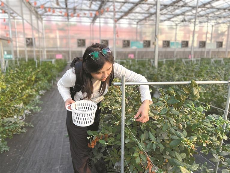 在迳口社区,还有一个新建的大棚蓝莓采摘园。1月17日下午,记者来到大棚蓝莓采摘园,在这里种植蓝莓的古国强告诉记者,蓝莓采摘园分为AB两个大棚,共占地15亩,园内的蓝莓是引进的澳大利亚品种——花香蓝莓。花香蓝莓的主要特点是甜度高,单果大,吃起来有淡淡的花香味。今年2月,大棚蓝莓采摘园里的蓝莓就完全成熟。