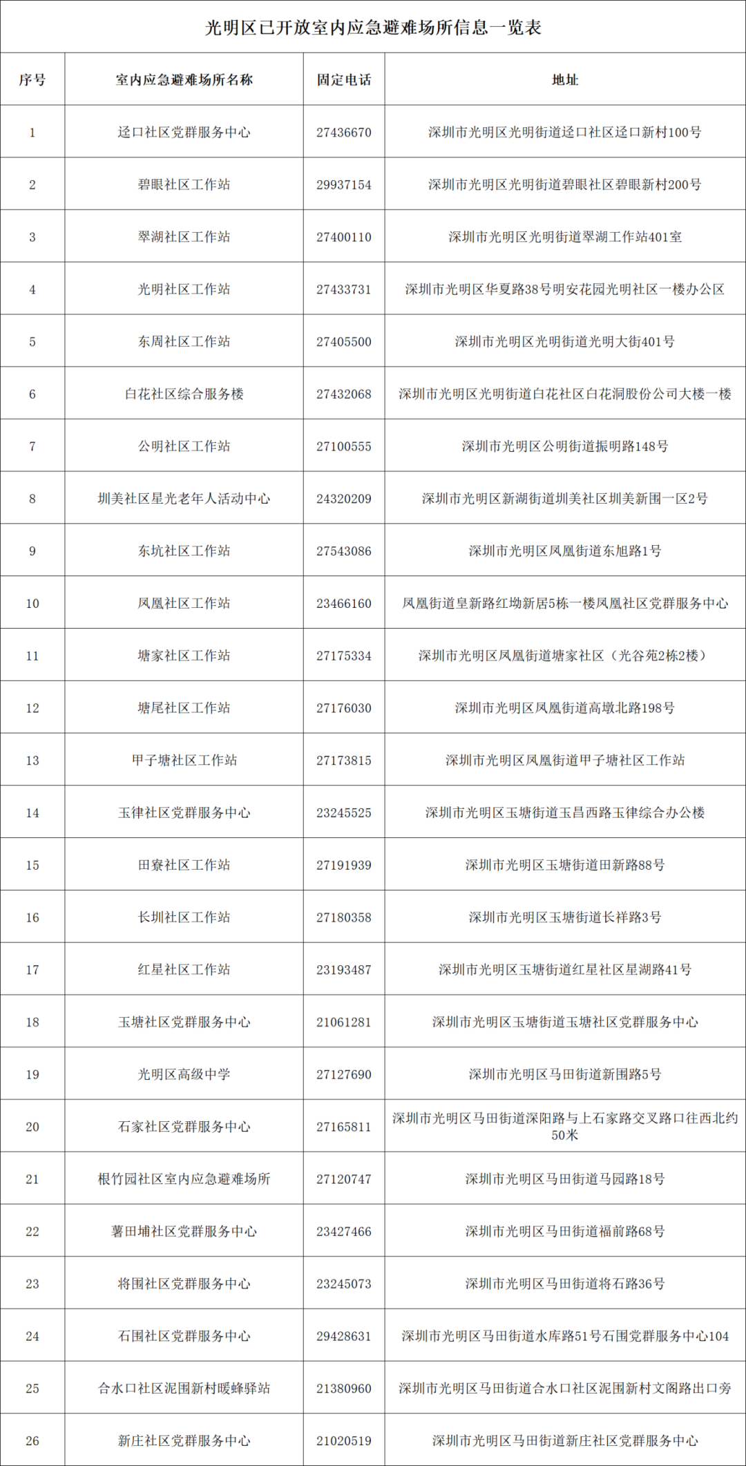 寒冷预警信号生效期间,有需要的市民可前往避寒。本次光明区开放的室内应急避难场所主要为各社区党群服务中心及社区工作站,市民如需前往,可关注“深圳光明”微信公众号,查询就近应急避难场所的准确地址与联系电话。