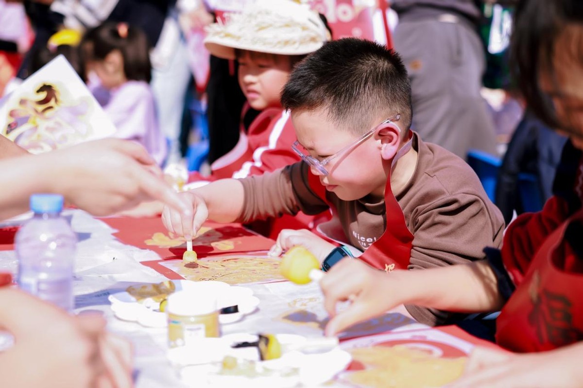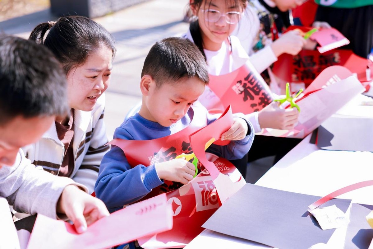 现场六大主题体验区各具特色,为居民带来丰富多彩的文化体验。“红纸墨韵,书写年味”让家长与孩子共同感受笔墨书香,书写对新年的美好祈愿;“纸间生花,巧手剪春”活动中孩子们巧手翻飞,一幅幅精美的窗花寄托着新春祝福;“印上春色,马拓福来”通过传统拓印技艺,让寓意吉祥的图案跃然纸上;“童乐新春,学俗纳福”通过抽签、趣味问答形式,巧妙地将春节民俗知识、语言表达能力与甲辰马年主题相结合;“福圈纳吉,喜迎春晖”充满欢声笑语,吸引了众多小朋友一试身手;“新愿上墙,福气满堂”则汇聚了居民们对新一年的真诚期盼与美好憧憬。