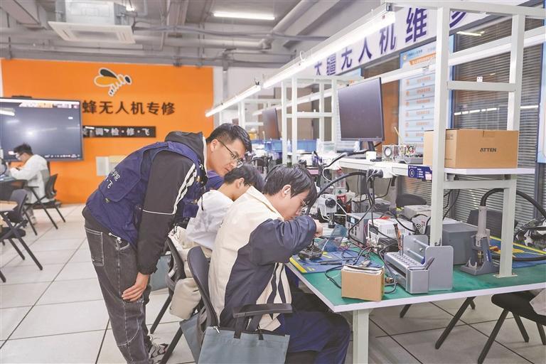 从18岁的年轻毕业生到转业军官,从想进入低空经济领域的创业者到被家长送来学技术的青少年,不同背景的学员在这里找到了共同的成长路径。截至目前,大黄蜂无人机专修已培训100余名学员,其中1/3经过机构推荐进入无人机售后岗位,其余学员或自主创业,或进入研发公司,均在低空经济领域实现了职业价值。
