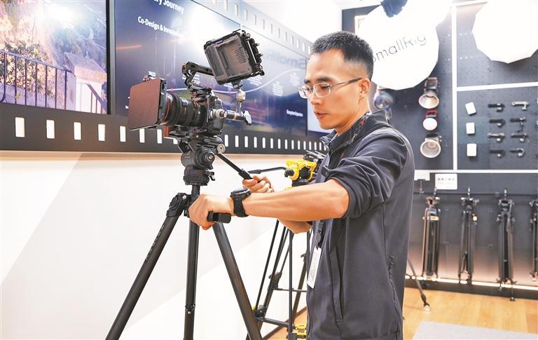 乐其创新SmallRig创始人、CEO 周阳展示三脚架产品。(资料图片)