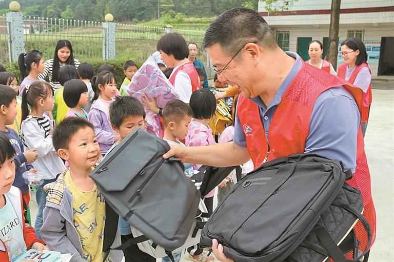 ▲2024年11月,刘镇在河源市和平县某小学进行助学物资捐赠。