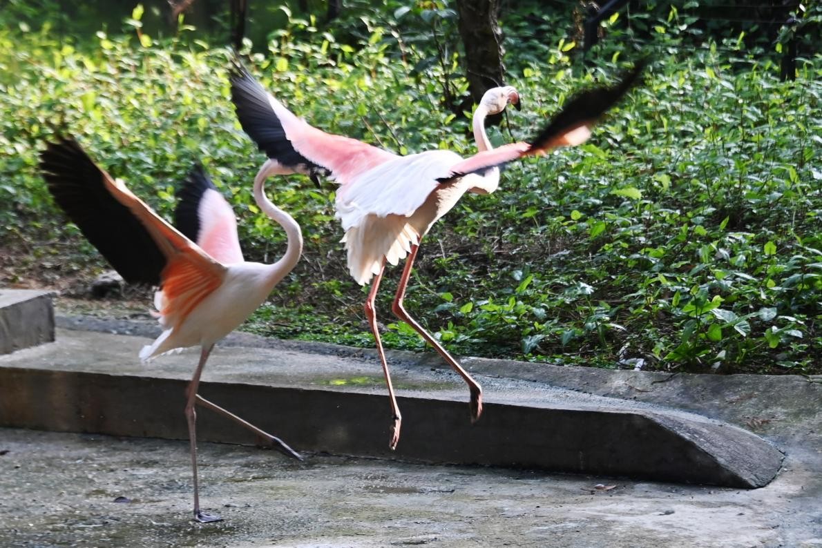 随着春季的到来,园内的火烈鸟求偶期也随之而来,火烈鸟出双入对,一起嬉戏、觅食,展开双翅“比翼双飞”,给春天的动物园增添了不少生趣。
