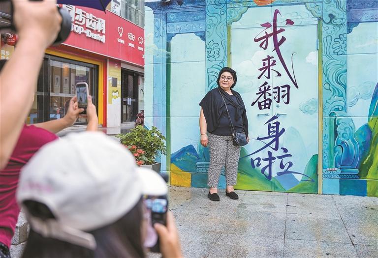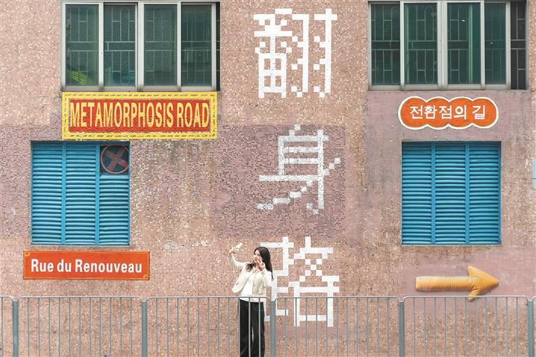 地铁翻身站出口的“锦鲤翻身”主题墙绘旁,快门声此起彼伏。