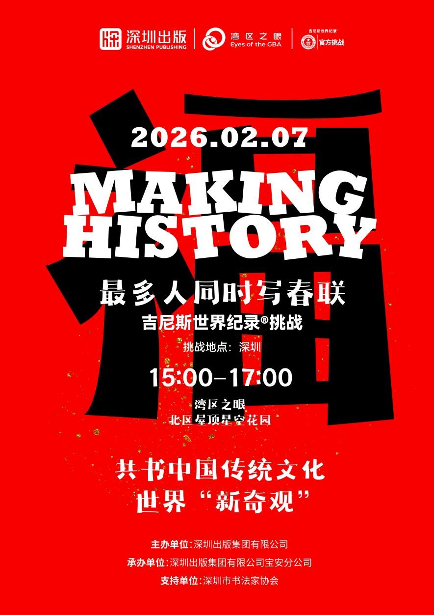 作为本次新春活动的开篇重头戏,“最多人同时写春联”吉尼斯世界纪录挑战将于2月7日15:00-17:00,在湾区之眼北区屋顶星空花园盛大启幕。深圳出版集团联合深圳市书法家协会,招募500名参与者同台挥毫,共书新春祝福。活动现场有书法名家亲临指导,让笔墨流转间传承中华文脉,让红火年味在集体创作中愈发浓厚。