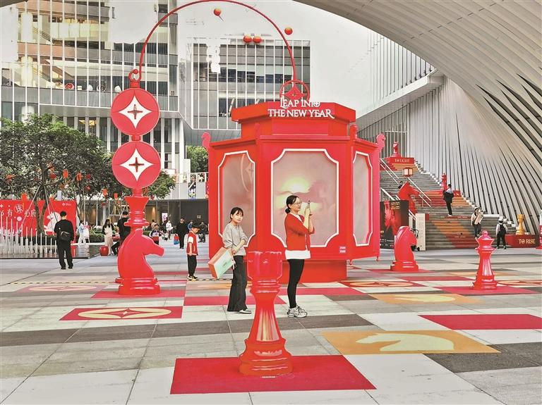 走近光明文化艺术中心,一座巨大的国际象棋引领游人漫步吉祥马年空间。一位老人带着小孙女,缓缓走过每一处布置,不时俯身讲解;不少孩子在地面上模仿棋子的走法,笑声清脆;年轻人纷纷举起手机,与巨型“马”棋子合影打卡。一位中年人点头赞叹:“国际象棋与中国传统生肖无缝衔接,有趣又有品味。”现场市民纷纷表示,这样的装饰既有年味儿又有文化味儿,让孩子们在玩耍中感受智慧的魅力。