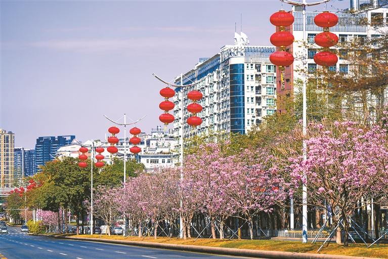 ▲龙华大道上,喜庆的红灯笼和盛开的紫花风铃木相映成趣,好不热闹。