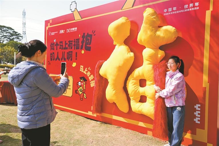 ▲市民在观湖中心公园花市“马上有福”展板前打卡拍照。