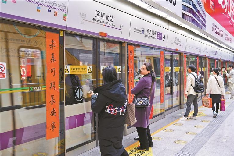 ▲地铁环中线深圳北站站台车厢门贴上了对联,十分喜庆。