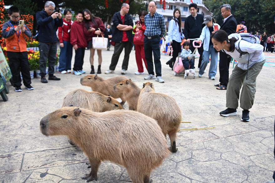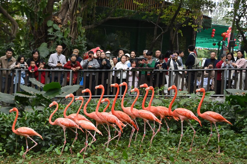 记者在现场看到,园内骏马、水豚“卡皮巴拉”、鹈鹕等动物在工作人员带领下巡游,上演别开生面的“迎宾秀”,游客可近距离与可爱动物互动,现场气氛欢乐热烈。湿地园区内,成群火烈鸟羽毛鲜艳、红红火火,在草地上有序漫步,如同列队迎接游客,处处洋溢着喜气洋洋、生机勃勃的新年氛围。