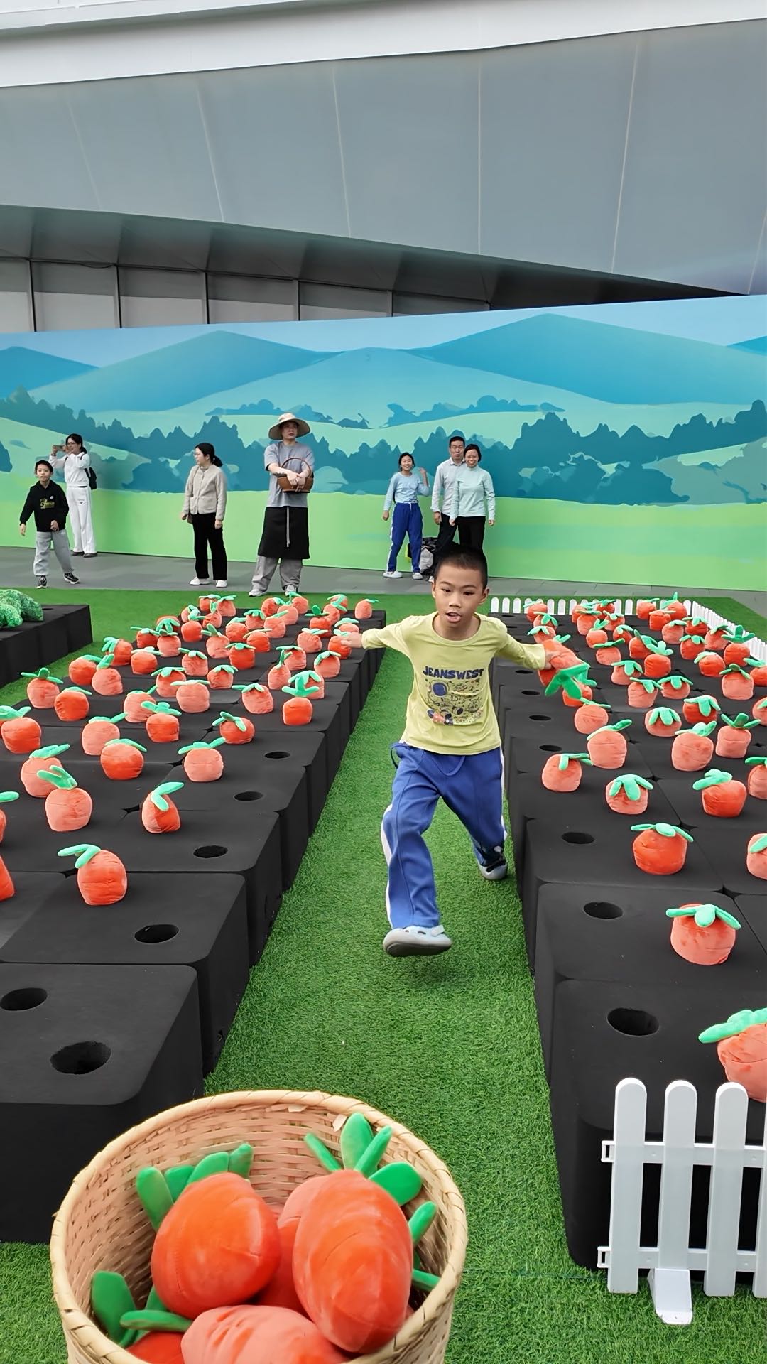 活动现场被打造为沉浸式体验空间。在核心互动区“高山树林农场”,高度还原的田埂与菜畦错落分布,吸引众多亲子家庭亲身“下地”,体验采收乐趣。区别于线上的定时“偷菜”,现场参与者可与亲友组队,开展“收菜接力大PK”,亲手摘取蔬菜玩偶并运送至收集筐,在欢声笑语中重温田园趣味。