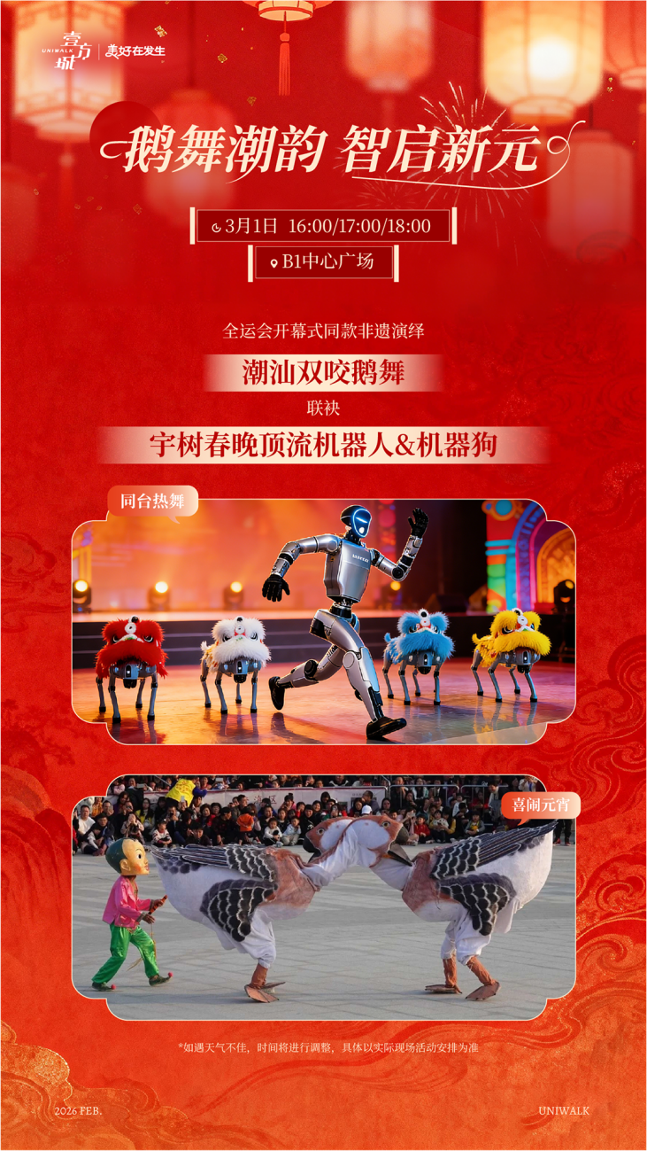 元宵佳节,灯火璀璨。为传承中华优秀传统文化、丰富深圳市民节庆体验,3月1日,前海壹方城将启幕“鹅舞潮韵,智启新元”元宵节主题活动。活动以“非遗+科技”为核心,带来全运会开幕式同款非遗潮汕双咬鹅舞、春晚同款机器人及机器狗互动体验,让传统民俗与前沿科技碰撞交融,为市民呈现一场有温度、有新意的元宵盛会。