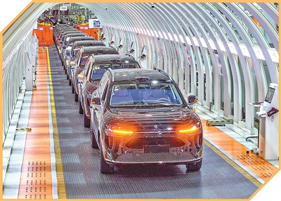 蔚来先进制造新桥二工厂总装车间内,座椅、保险杠等汽车零部件刚从合作伙伴工厂下线,便经400米自动化轨道直送生产线。“以前这些大件都要跨省采购、运输。”蔚来先进制造新桥二工厂负责人殷亮指着这条空中通道说。