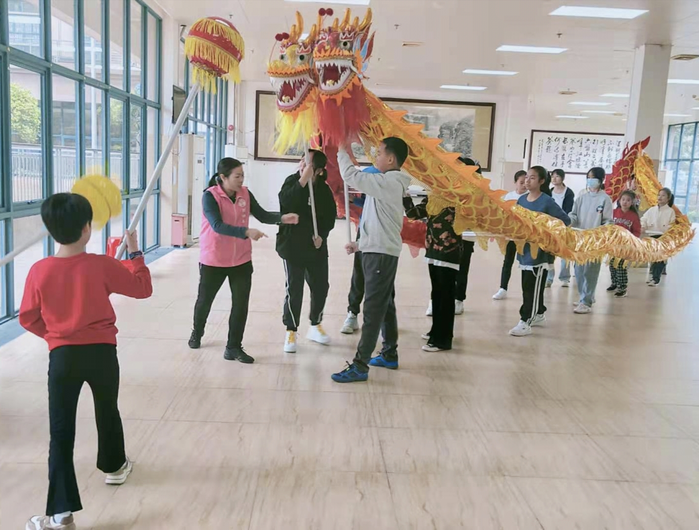 身穿巾帼粉马甲的刘映美,在耐心教授孩子们舞龙技巧。