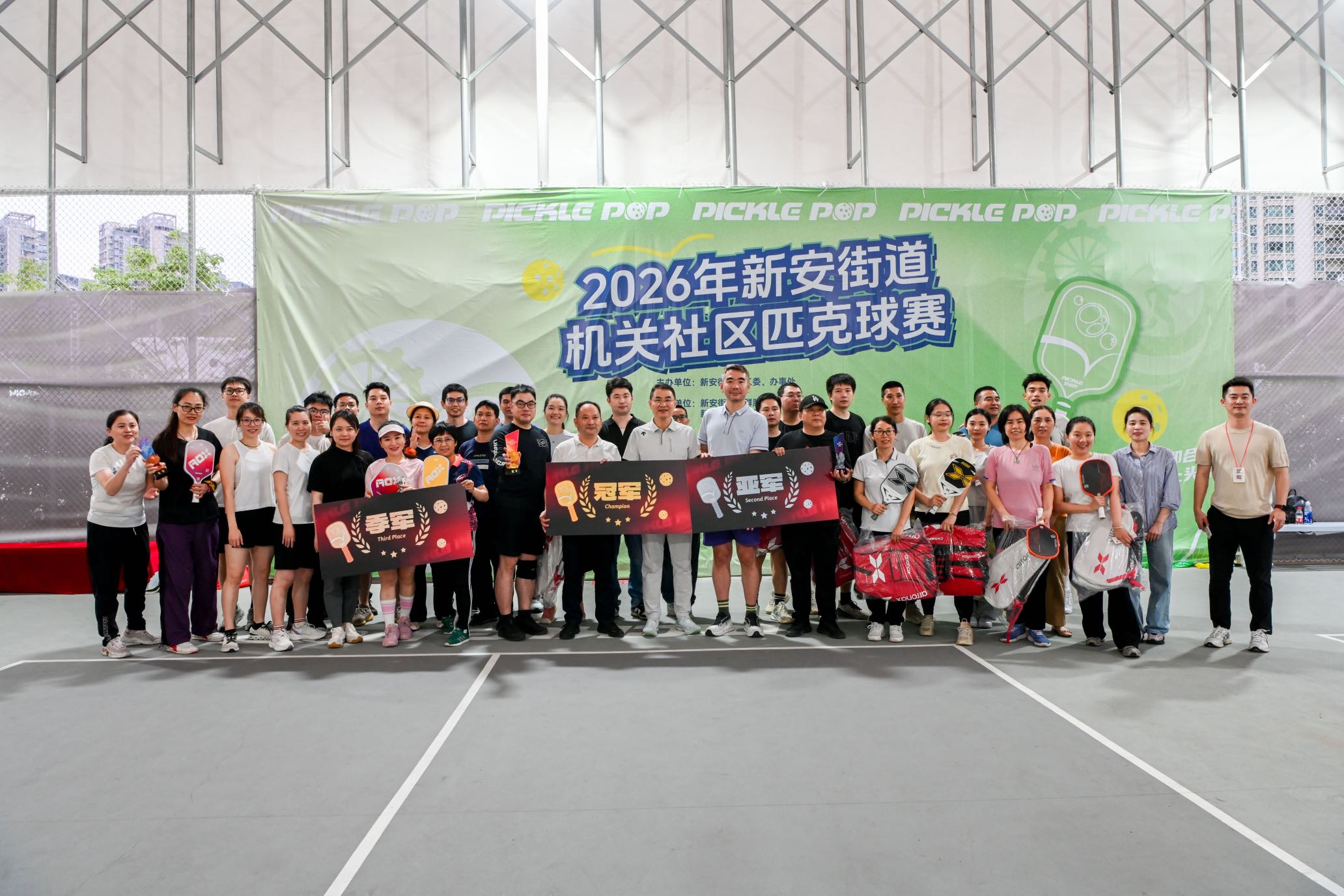 3月28日,2026年新安街道机关社区匹克球赛在海旺角文体中心匹克球馆圆满落幕。经过一天的激烈角逐,宝民社区凭借默契的配合与稳定的发挥勇夺冠军,海乐社区紧随其后摘得亚军,洪浪社区则荣获季军。