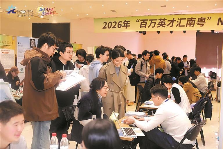 3月27日,“百万英才汇南粤”2026年N城联动春季招聘中国科学技术大学专场在合肥举行,光明区携深圳湾实验室、深圳先进光源研究院、比亚迪、拓竹科技等50家深圳优质企事业单位、7400余个高薪岗位跨越山海,向中科大英才抛出“橄榄枝”,上演湾区科创高地与学术殿堂的春日邂逅。
