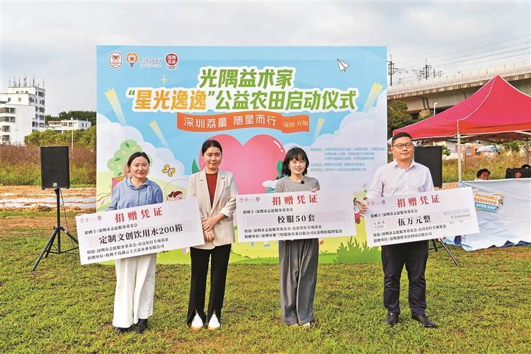 启动仪式上,政府、高校、企业、社会组织代表与“星宝”(孤独症儿童)家庭齐聚一堂,共同见证多方共建的公益范式。中山大学“返家乡”课题组深入全区调研孤独症儿童状况,用数据为项目奠基;深圳职业技术大学艺术设计学院师生在熊涛涛教授带领下,将课堂搬进田野,从景观装置到文创设计,用专业赋能公益。两所高校构成了项目的“人才蓄水池”,双校联动,让这片农田不仅长庄稼,更长人才、长希望,让公益不再依赖一时热情,而有了可持续的智力支撑。创维光伏、云上天泉提供启动资金与物资保障,雅兰特校服为“星宝”捐赠专属校服,晨光乳业、大米和小米等爱心企业组建“星链”联盟。企业对接高校智力,高校获得实践场域,社会组织找到专业支持,所有力量最终汇向同一个目标:为“星宝”家庭提供更优质、更持续的服务。深圳市志愿服务基金会·点亮专项基金负责资金监管,确保每一份善意都有去向、有回响。