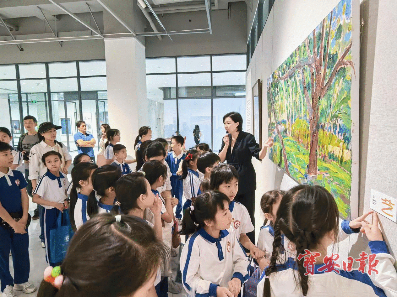 展厅内,学生们聚精会神地观看作品,讲解员围绕画作背后的创作故事与城市文化内涵展开讲述。小学六年级的张宇表示,非常喜欢动漫绘画,对描绘红树湾景致的中国画作品感触尤深:“小时候经常去,现场看到中国画风的红树林,画面里的意境和笔触让我有新的理解。”她的同学沈思彤则说:“今天不仅看了画家展,还听陈浩老师讲解了篆刻的方法,学到了很多。”