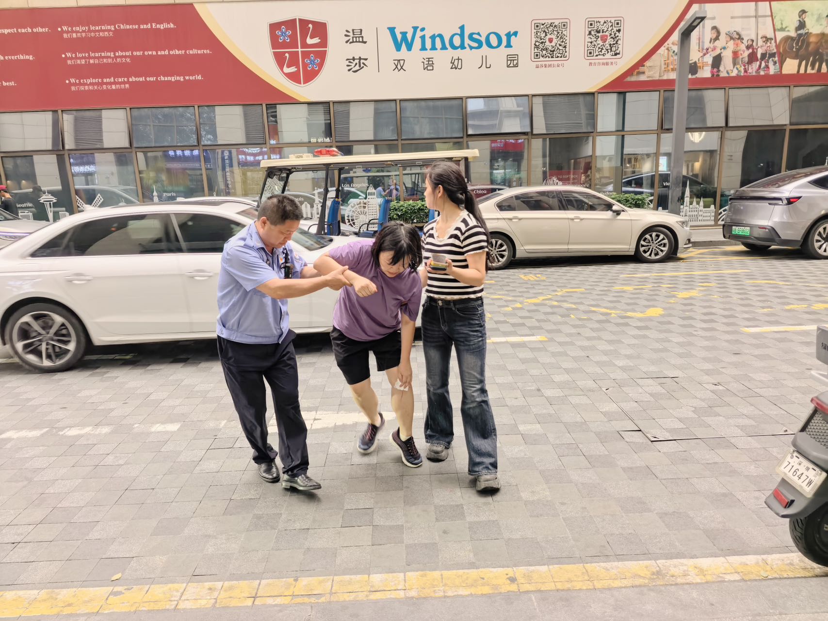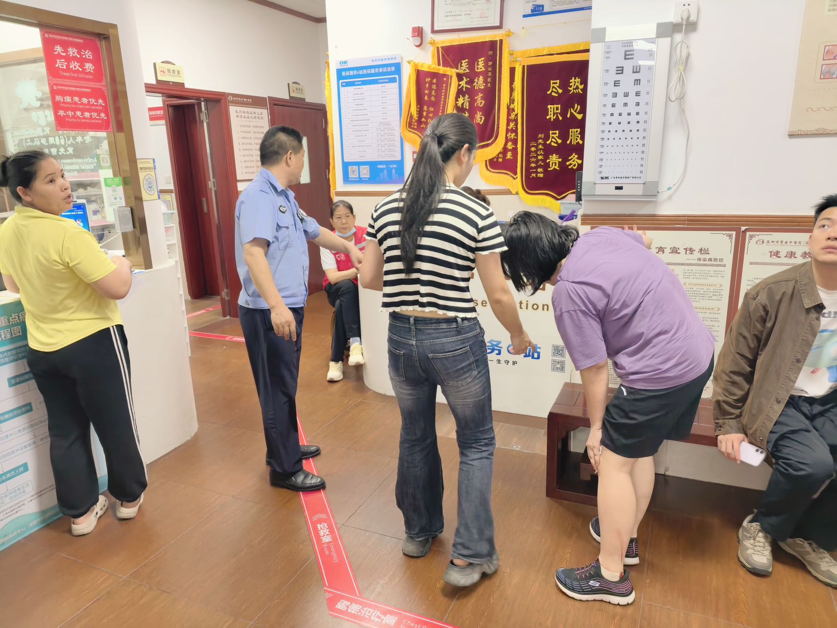 当日下午5时,新安街道海旺社区网格巡查中队长黎明和网格员徐亮正坚守岗位,开展周末消防隐患排查工作,当两人走到海旺文体中心新福路路段时,一名居民匆匆从附近赶来,神色慌张地向值班人员求助,称有一名女子在附近不慎磕碰导致膝盖受伤,伤口流血不止,情况紧急,急需送往医院救治。