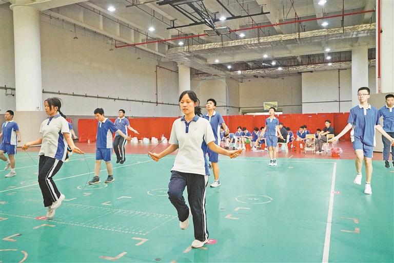 记者在观澜中学考点现场看到,考点入口处设置了清晰的指引标识,考生们身着宽松服饰,在老师的引导下有序排队、核验信息、进入考场。热身区内,同学们舒展筋骨、调整状态,彼此加油鼓劲,眼神中满是坚定与自信;测试场地内,发令声响、跳绳翻飞、运球落地、奔跑冲刺的声音交织在一起,考生们全力以赴、奋勇拼搏,每一次发力、每一次冲刺都尽显青春朝气,监考老师与裁判员全程专注执裁,细致记录考生考试成绩。