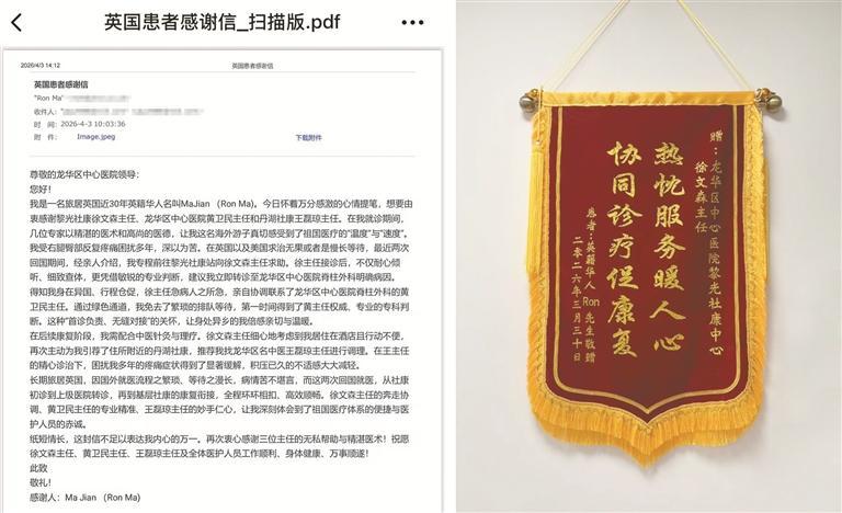 写信人Ron Ma是一名旅居英国近30年的英籍华人,他在信中讲述了自己在龙华从社康初诊、上级医院转诊到基层康复“无缝衔接”的就医历程,字里行间满是对祖国医疗“速度”与“温度”的认可。