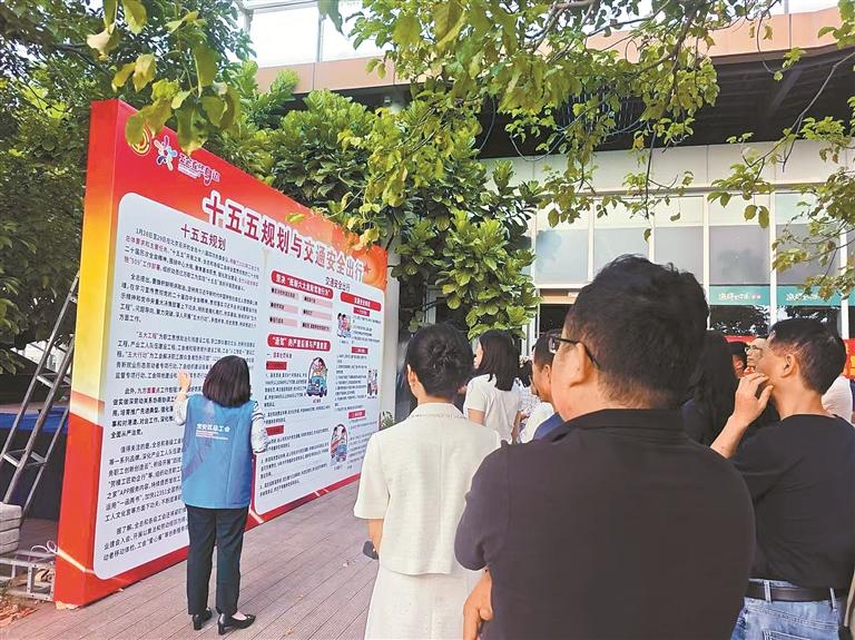 先行示范工联会干部向职工介绍“十五五”规划与交通安全出行内容。