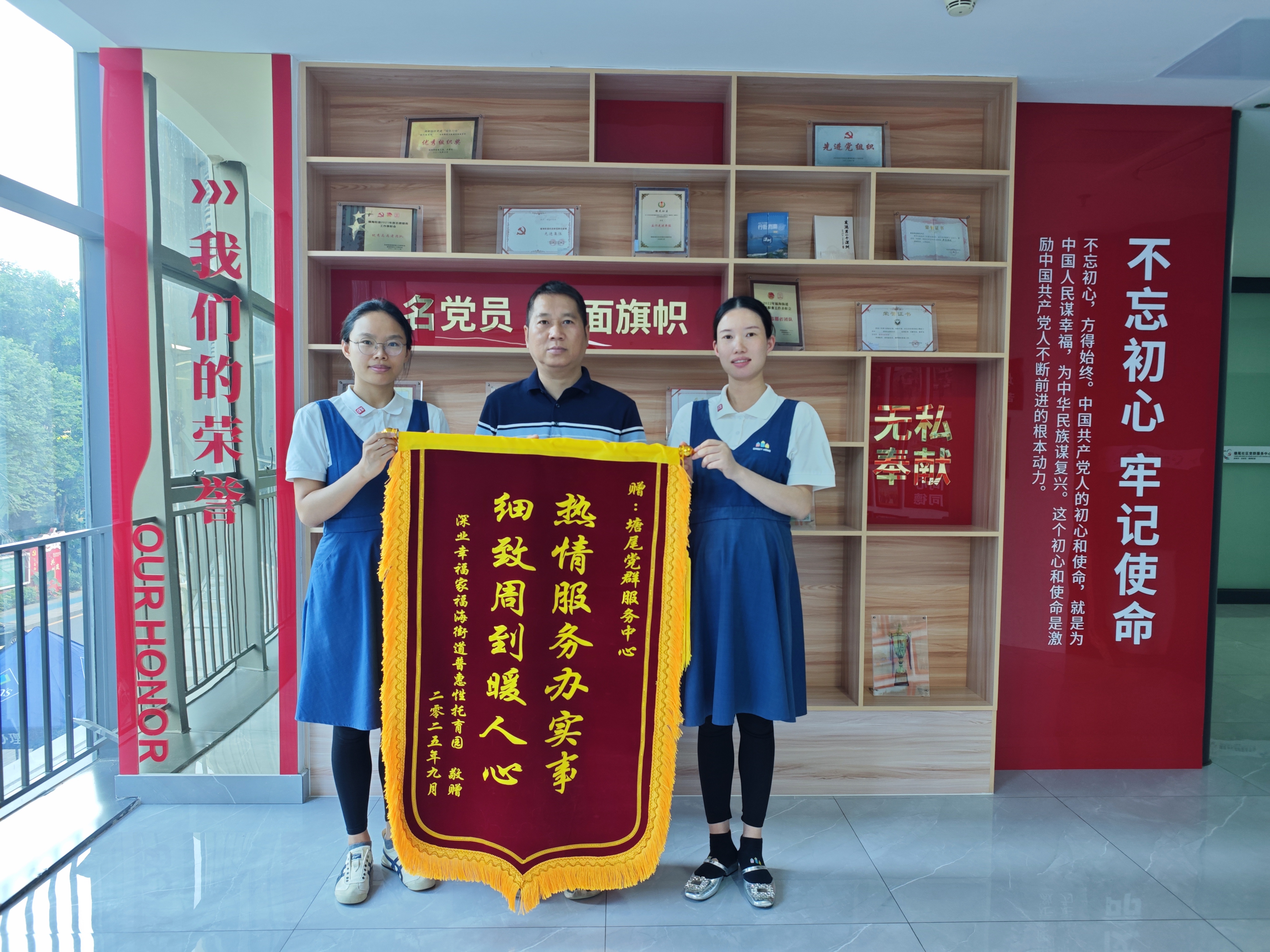 近日,福海街道深业幸福家托育园将一面印着“热情服务办实事,细致周到暖人心”的锦旗专程送到塘尾社区党群服务中心,以此感谢党群中心长期以来对托育园工作的大力支持与贴心帮助。