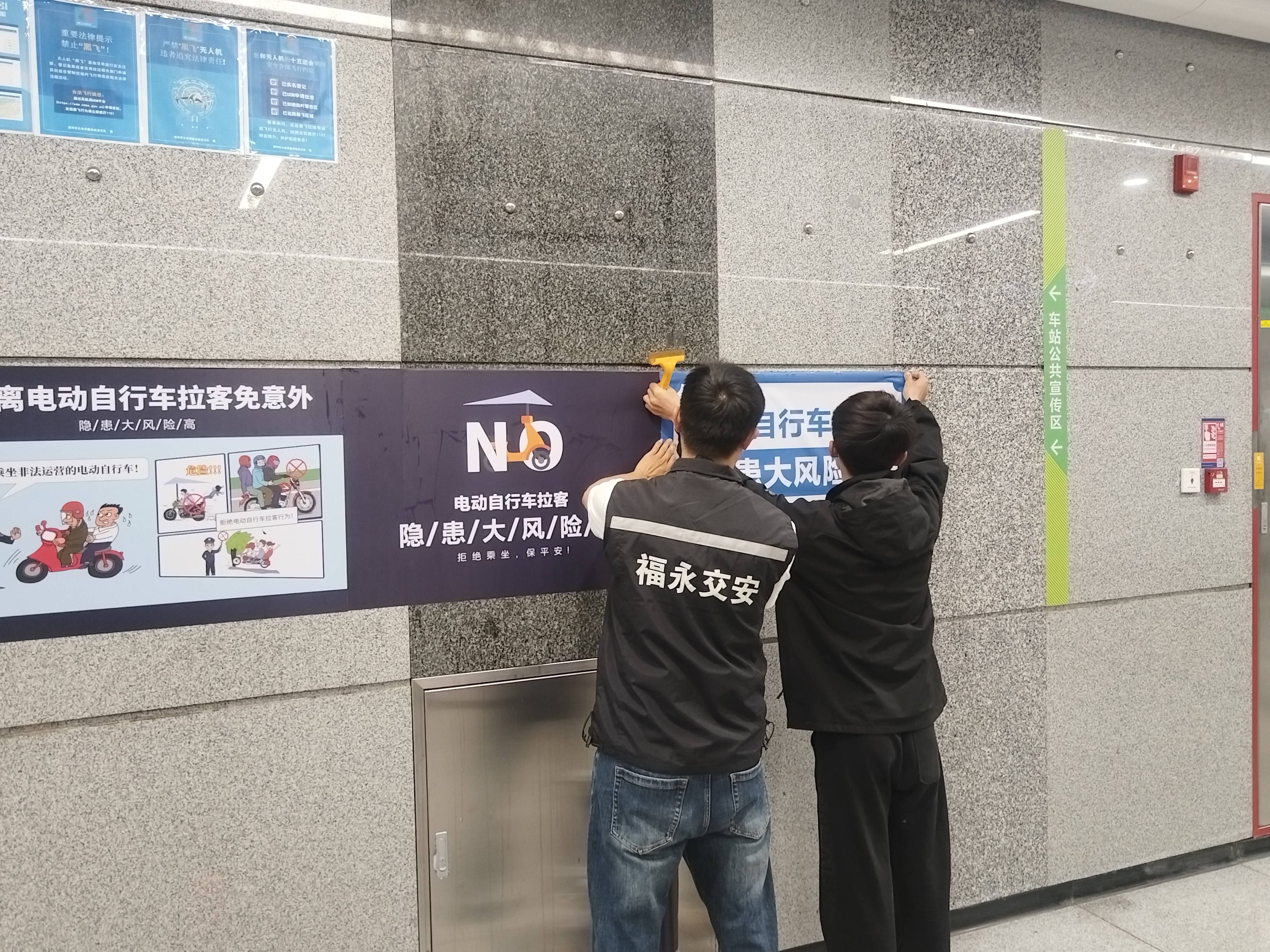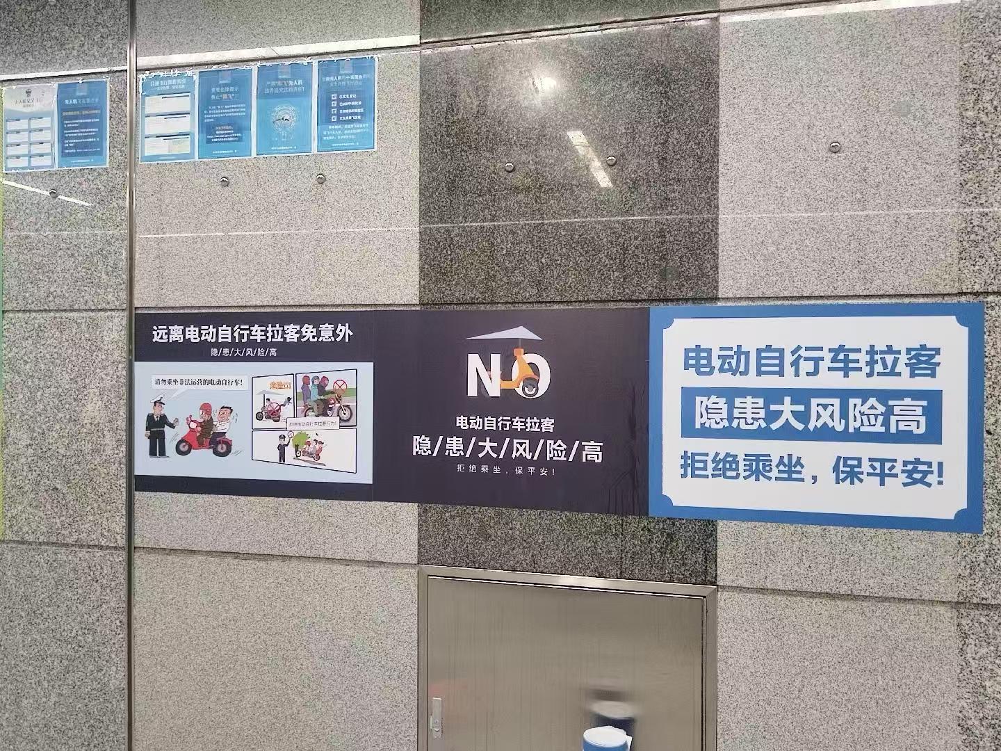 现场张贴的宣传海报以“远离电动自行车拉客免意外”“隐患大风险高”“拒绝乘坐保平安”为核心标语,搭配漫画直观呈现非法拉客电动自行车无资质、易肇事、难追责等方面的风险,海报精准覆盖各站点出入口、候车区等乘客高频停留区域,引导市民自觉抵制非法载客的违规及危险行为。不少进出站市民驻足查看,市民李女士坦言:“标语很醒目,一看就知道这种车不能坐,比口头提醒管用。”