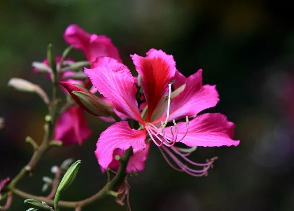 紫荆:花期主要在冬春季,花朵从淡粉到深紫渐变,花大如掌。紫荆树形优美,常绿乔木,是南方常见的观赏树种。