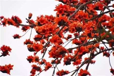 木棉(英雄树):早春2-3月开花,先花后叶,橙红色花朵如火焰般热烈。木棉树形高大挺拔,树皮灰白色,幼树树干有圆锥状粗刺。花可入药,有清热利湿、解暑功效。