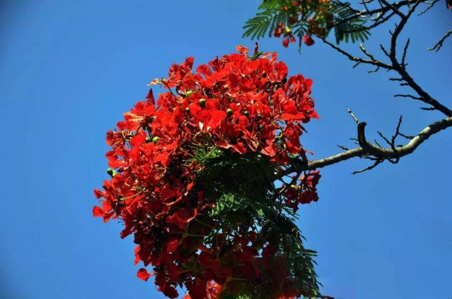 凤凰木:5-7月盛放,鲜红至橙红色的花朵大而艳丽,被誉为"叶如飞凰之羽,花若丹凤之冠"。凤凰木生长迅速,树冠开展如伞,是热带地区优良的遮荫树和行道树。