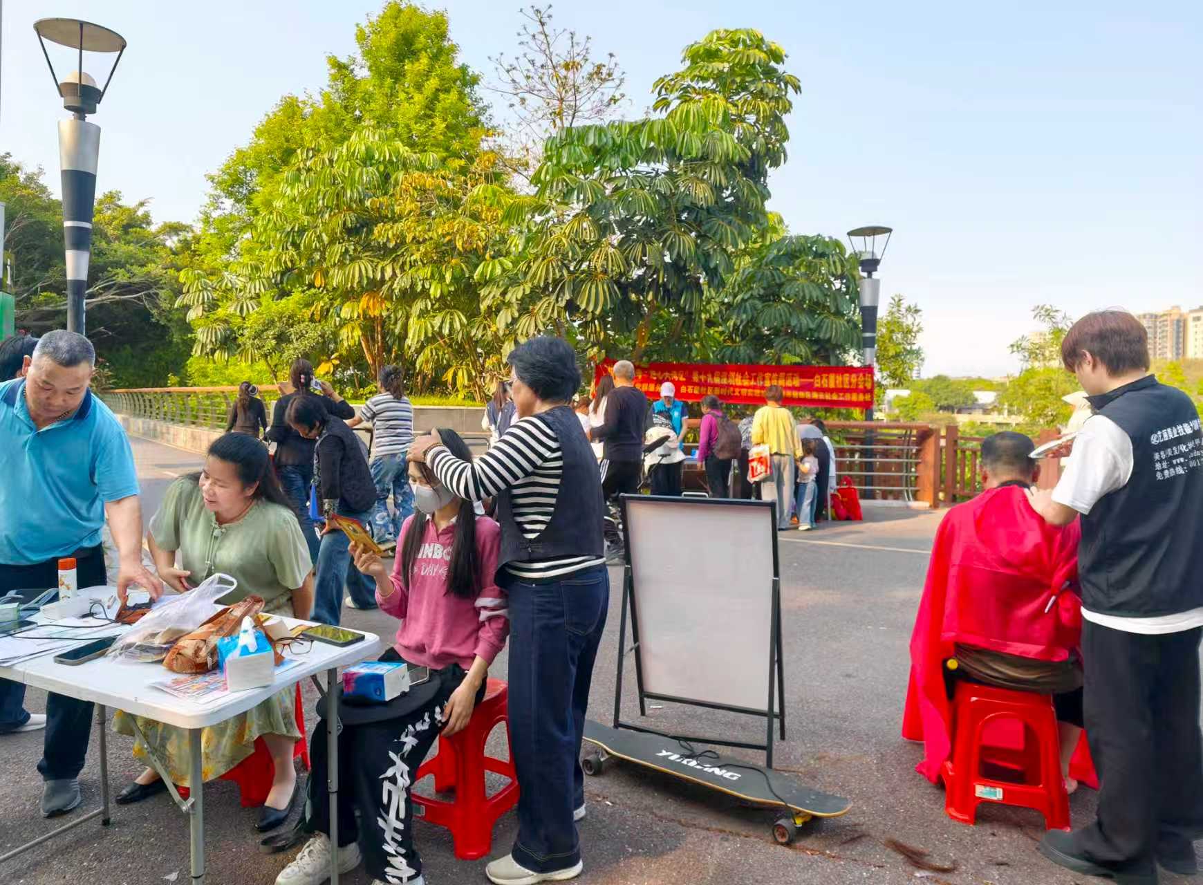便民服务摊位前人气十足,专业人员为居民提供免费剪发、颈肩推拿、口腔筛查等服务,切实回应居民多样化便民需求。社工全程引导居民有序参与,耐心收集反馈,用贴心服务搭建与居民沟通的桥梁。