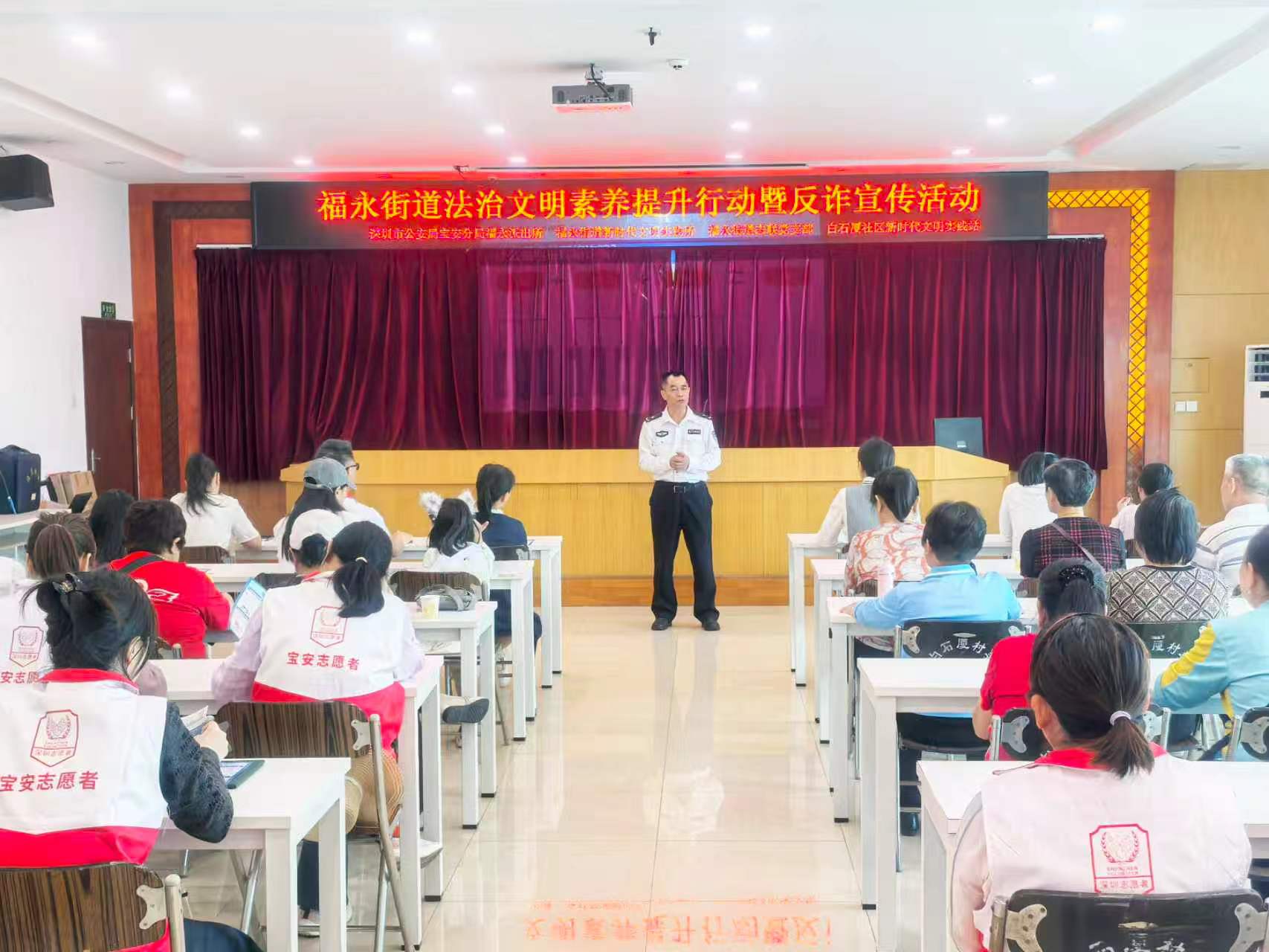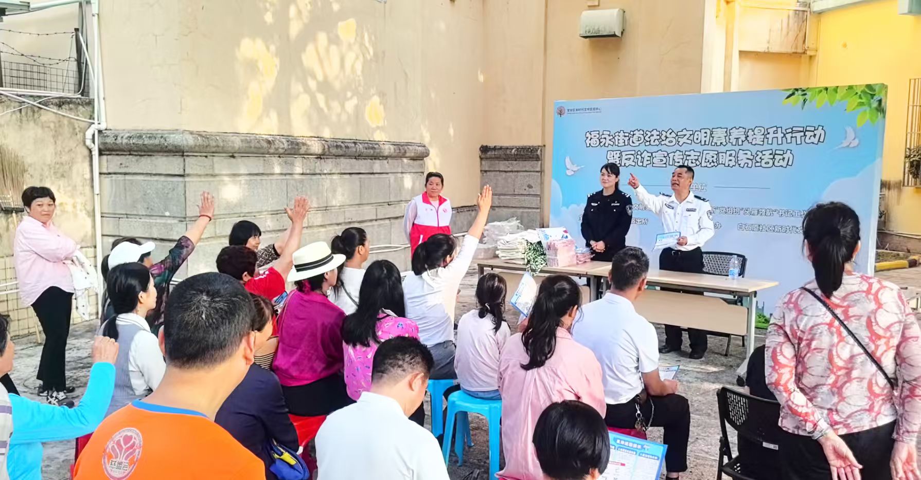 据介绍,此次系列活动是福永街道新时代文明实践所推进法治文明建设、提升群众反诈素养的一次积极实践,通过“建队伍、强培训、活形式、促长效”构建警民参与、覆盖全域的反诈宣传浓厚氛围,推动居民群众提升文明法治素养。